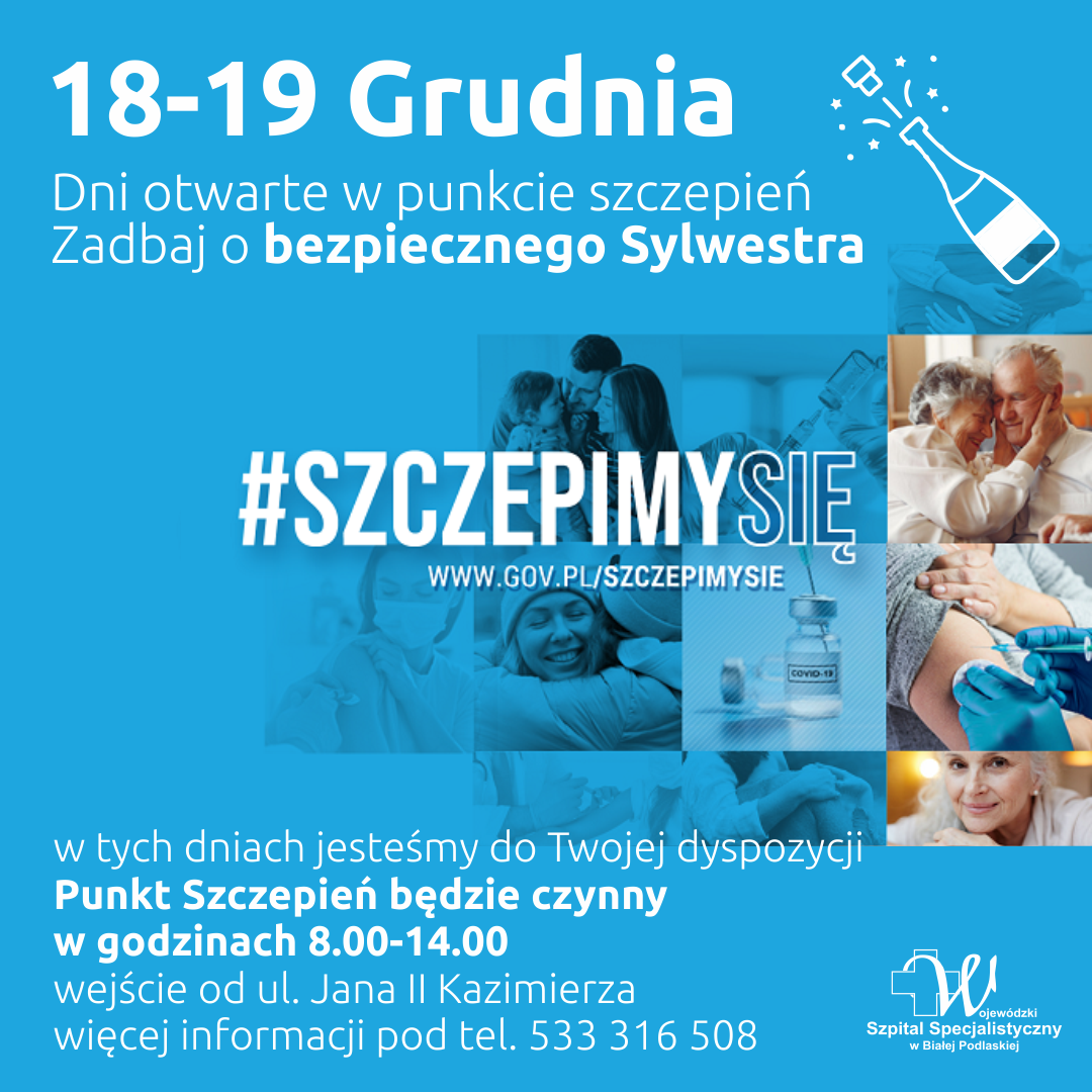 W dniach 18-19 grudnia 2021r. w bialskim szpitalu odbędą się kolejne Dni Otwarte w Punkcie Szczepień. Każda osoba w tych dniach będzie miała możliwość realizacji szczepienia przeciwko COVID-19 oraz przeciwko grypie.