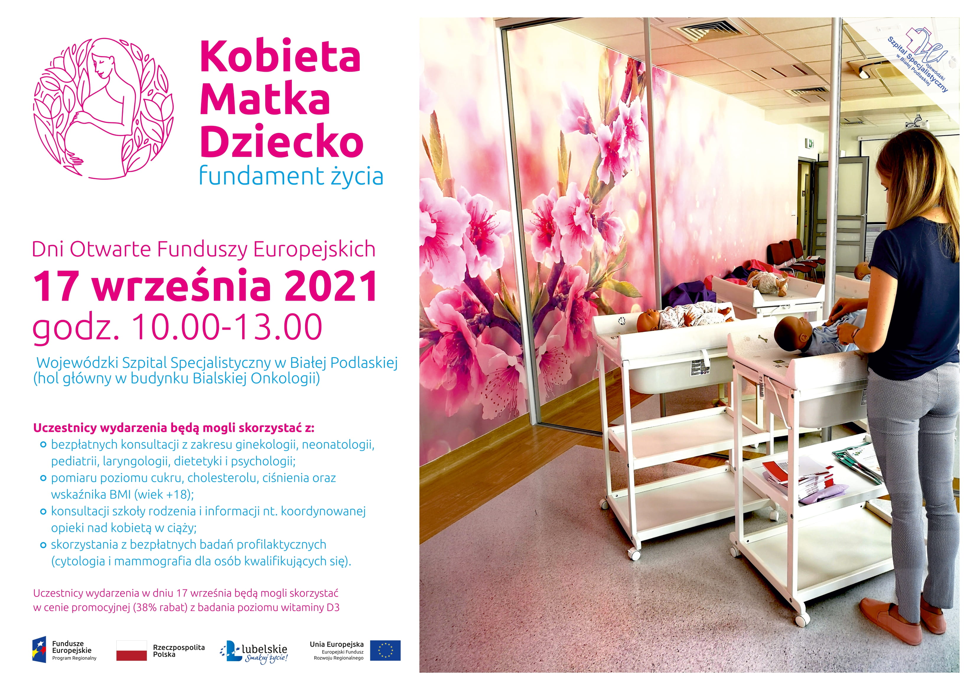 Zapraszamy na Dni Otwarte Funduszy Europejskich pt. "Kobieta Matka Dziecko Fundament Życia" w dniu 17 września 2021r. w godz. 10.00 - 13.00 w holu głównym budynku "Bialskiej Onkologii".