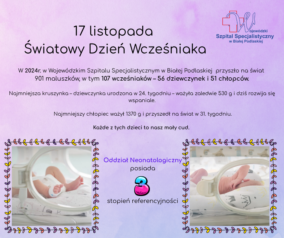 Święto, które przypomina o sile i niezwykłej determinacji najmniejszych pacjentów oraz ich rodzin. Z tej okazji budynek Wojewódzkiego Szpitala Specjalistycznego w Białej Podlaskiej zostanie podświetlony na kolor fioletowy – barwę, która ma wyjątkowe znaczenie dla wcześniaków i tych, którzy się nimi opiekują. Fioletowy to kolor delikatności, spokoju i nadziei. Symbolizuje osoby wyjątkowo wrażliwe. Wielu rodziców, po raz pierwszy widząc swoje dziecko w inkubatorze, zwraca uwagę, że ich maluszek nie jest różowy jak większość noworodków urodzonych w terminie. Skóra wcześniaka ma często odcień sinofioletowy. To znak jego niedojrzałości, kruchości i ogromnego wysiłku, jaki jego organizm podejmuje, by się przystosować. Warto jednak pamiętać, że fiolet w palecie barw jest blisko różowego i właśnie na granicy tych kolorów, kryje się nadzieja. Bo dzięki swojej sile, wytrwałości i opiece zespołu specjalistów Oddziału Neonatologicznego, te maleństwa krok po kroku zmierzają ku zdrowiu. Ich skóra nabiera różowych odcieni, a ich życie – koloru, ciepła i blasku. To jest cel zespołu Oddziału Neonatologicznego – by przeprowadzić wcześniaka przez najtrudniejszy początek życia, by uratować i ocalić to, co najcenniejsze: życie i zdrowie dziecka. Każdy dzień spędzony na oddziale to walka o oddech, o siłę, o przyszłość. A każda chwila, gdy mały pacjent wychodzi ze szpitala w ramionach rodziców, to potwierdzenie, że ta walka ma sens.