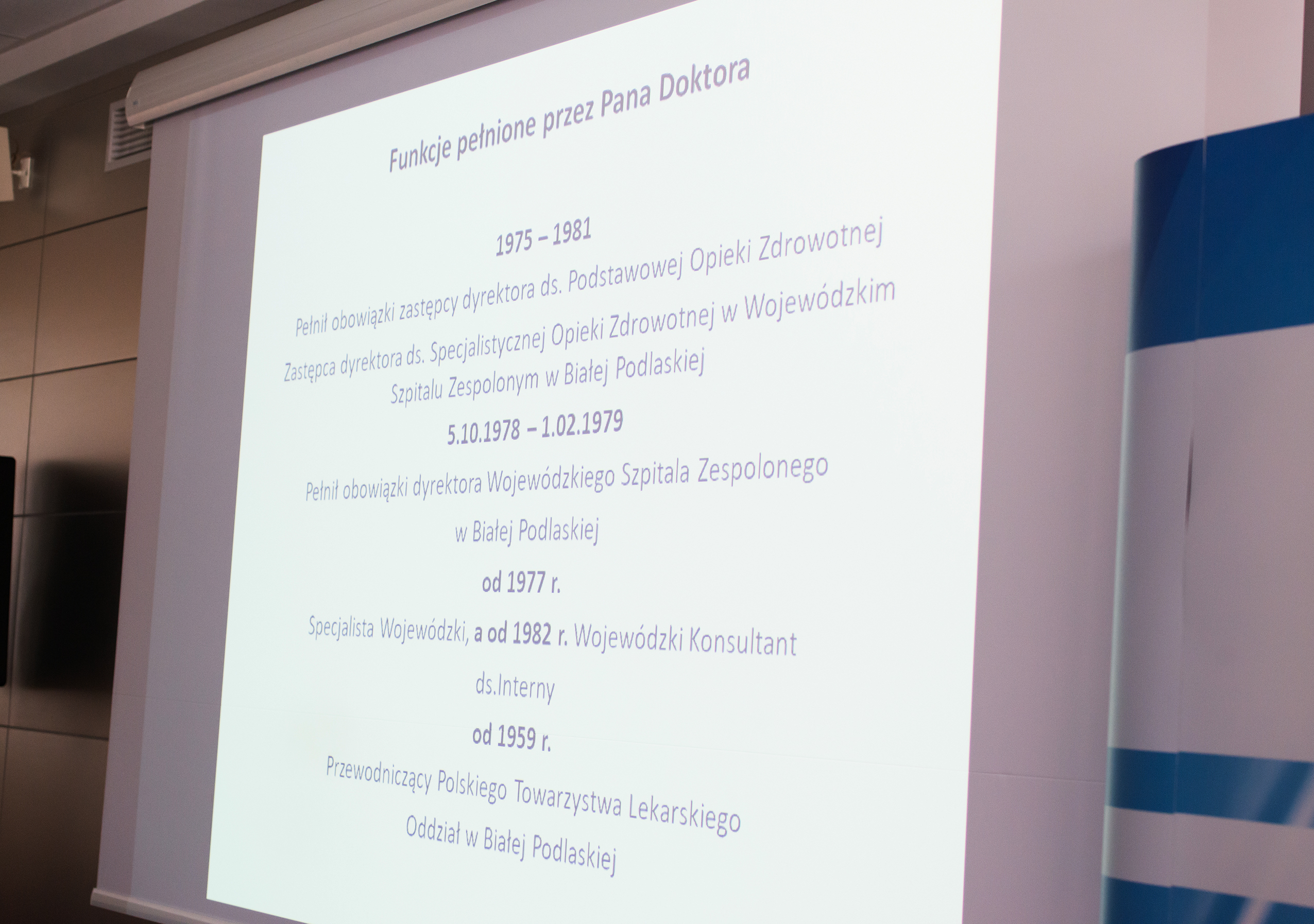 Kolejnym punktem uroczystości było wspomnienie lek. Mariana Matyńkowskiego (1935-2013) – Ordynatora Oddziału Wewnętrznego w latach 1973-2000. Sylwetkę Pana Doktora przybliżyła lek. Jolanta Siwek-Iwanicka.