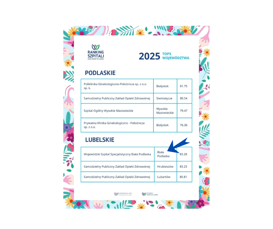 Dziś Oddział Ginekologiczno-Położniczy w Białej Podlaskiej jest liderem – pierwsze miejsce w województwie lubelskim w rankingu „Rodzić po ludzku” 2025 oraz w TOP 10 w całej Polsce. To efekt skutecznych decyzji, zdecydowanej reakcji na kryzys i wytężonej pracy całego zespołu, które uratowały naszą porodówkę i przywróciły jej renomę.