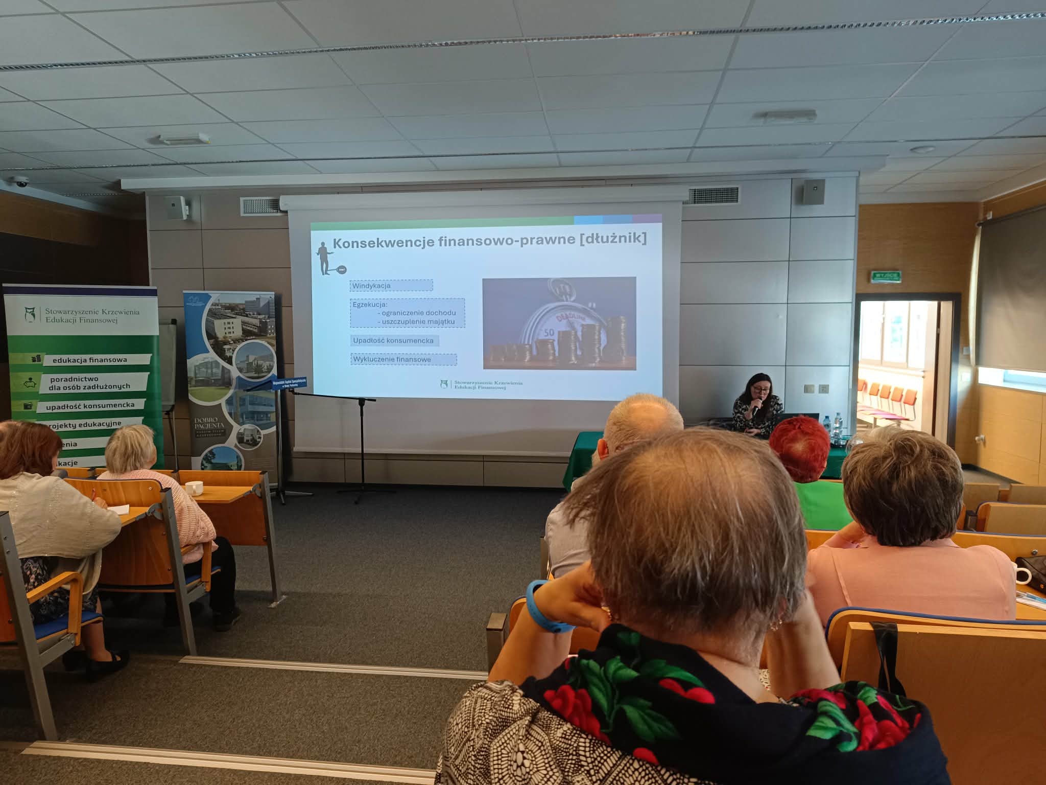 Tym razem uczestnicy mieli okazję poszerzyć swoją wiedzę na temat prawnych uwarunkowań zjawiska nadmiernego zadłużenia. Podczas spotkania omówiono, czym jest nadmierne zadłużenie oraz jakie są jego najczęstsze przyczyny i konsekwencje prawne. Uczestnicy dowiedzieli się również, jakie obowiązki i prawa ma osoba zadłużona, w jaki sposób wierzyciele mogą dochodzić swoich należności oraz jak wygląda postępowanie sądowe w sprawach dotyczących długów. Poruszono także kwestie związane z egzekucją komorniczą, w tym jakie dochody i świadczenia podlegają ochronie. Wszystko to omówiono na konkretnych przykładach.