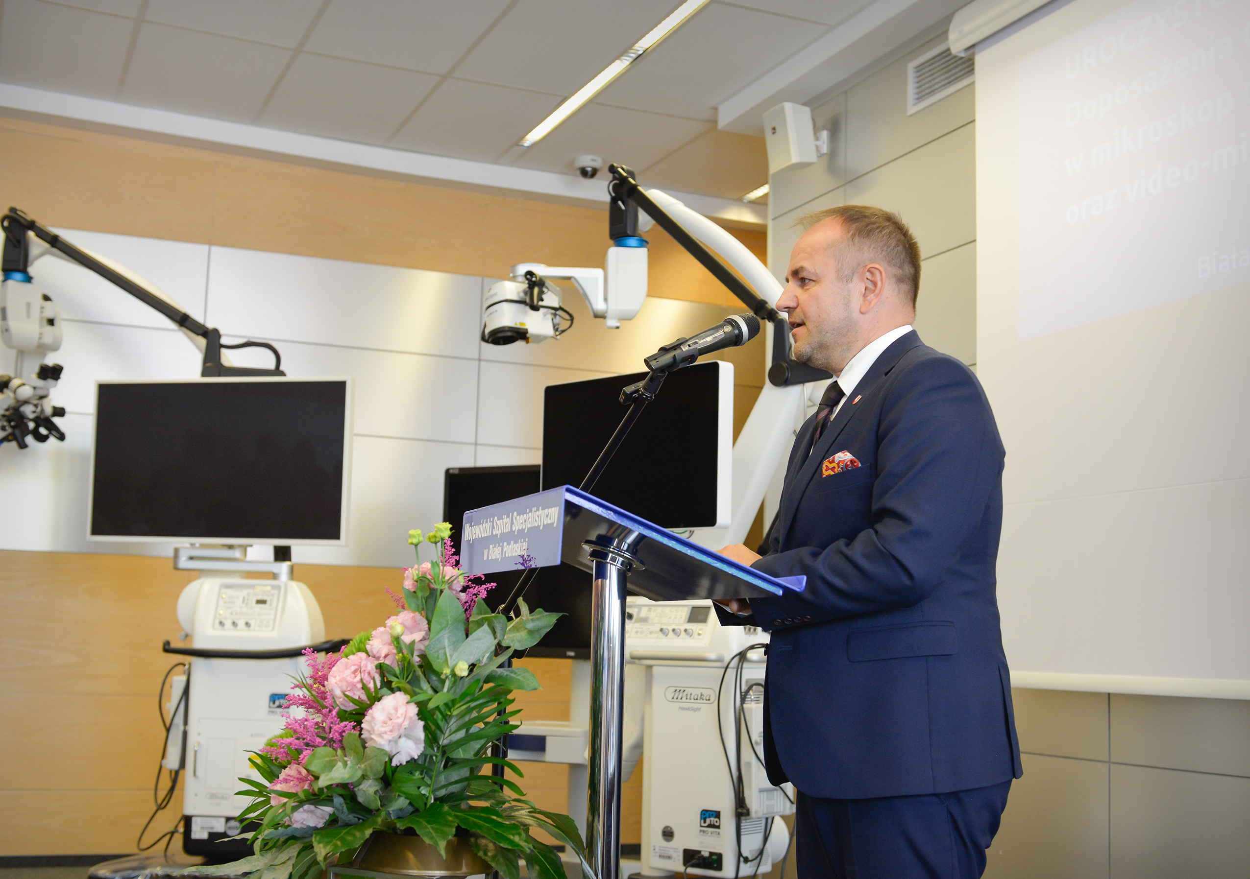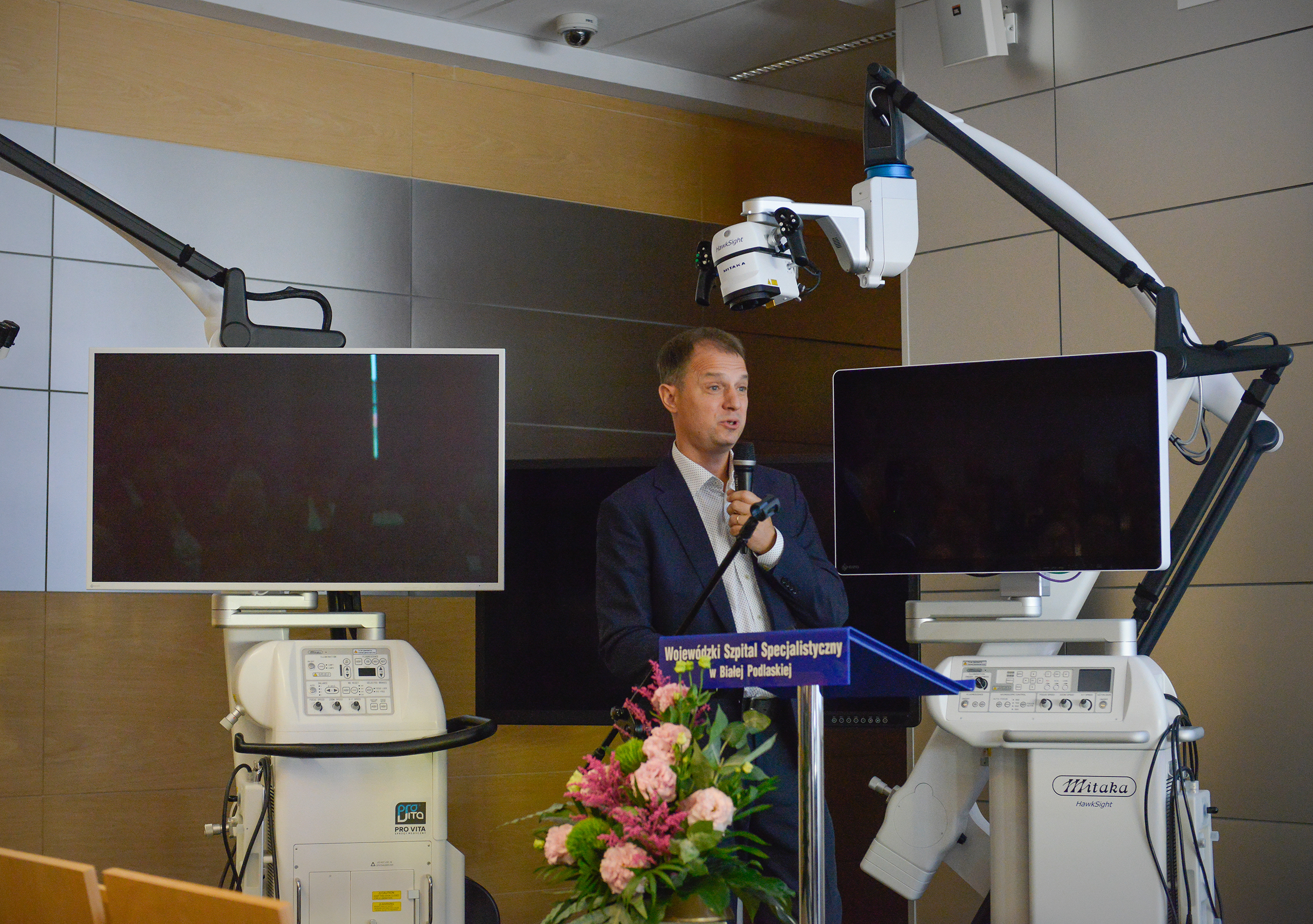 Wydarzenie rozpoczął Pan Dyrektor Artur Kozioł, który uroczyście powitał wszystkich gości i zaprezentował inwestycję uruchomienia w Wojewódzkim Szpitalu Specjalistycznym w Białej Podlaskiej nowo zakupionego sprzętu: mikroskopu operacyjnego neurochirurgicznego i video-mikroskopu, jedynego takiego na dzień dzisiejszy w Europie.