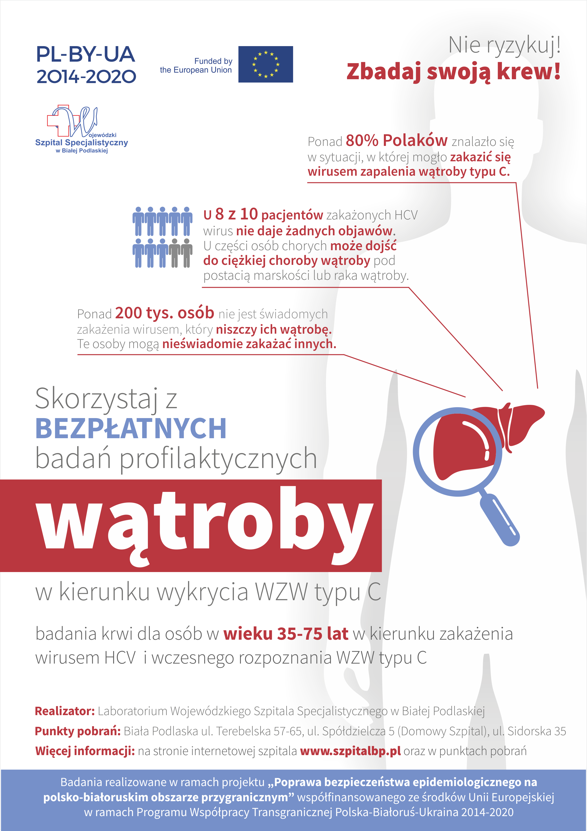 Wojewódzki Szpital Specjalistyczny w Białej Podlaskiej zaprasza mieszkańców miasta Biała Podlaska oraz powiatów bialskiego, radzyńskiego, parczewskiego, włodawskiego i łukowskiego w wieku 35-75 lat na bezpłatne badania przesiewowe krwi na obecność wirusa HCV, w kierunku wczesnego rozpoznania wirusowego zapalenia wątroby typu C (WZW C).