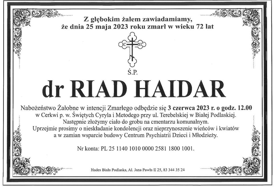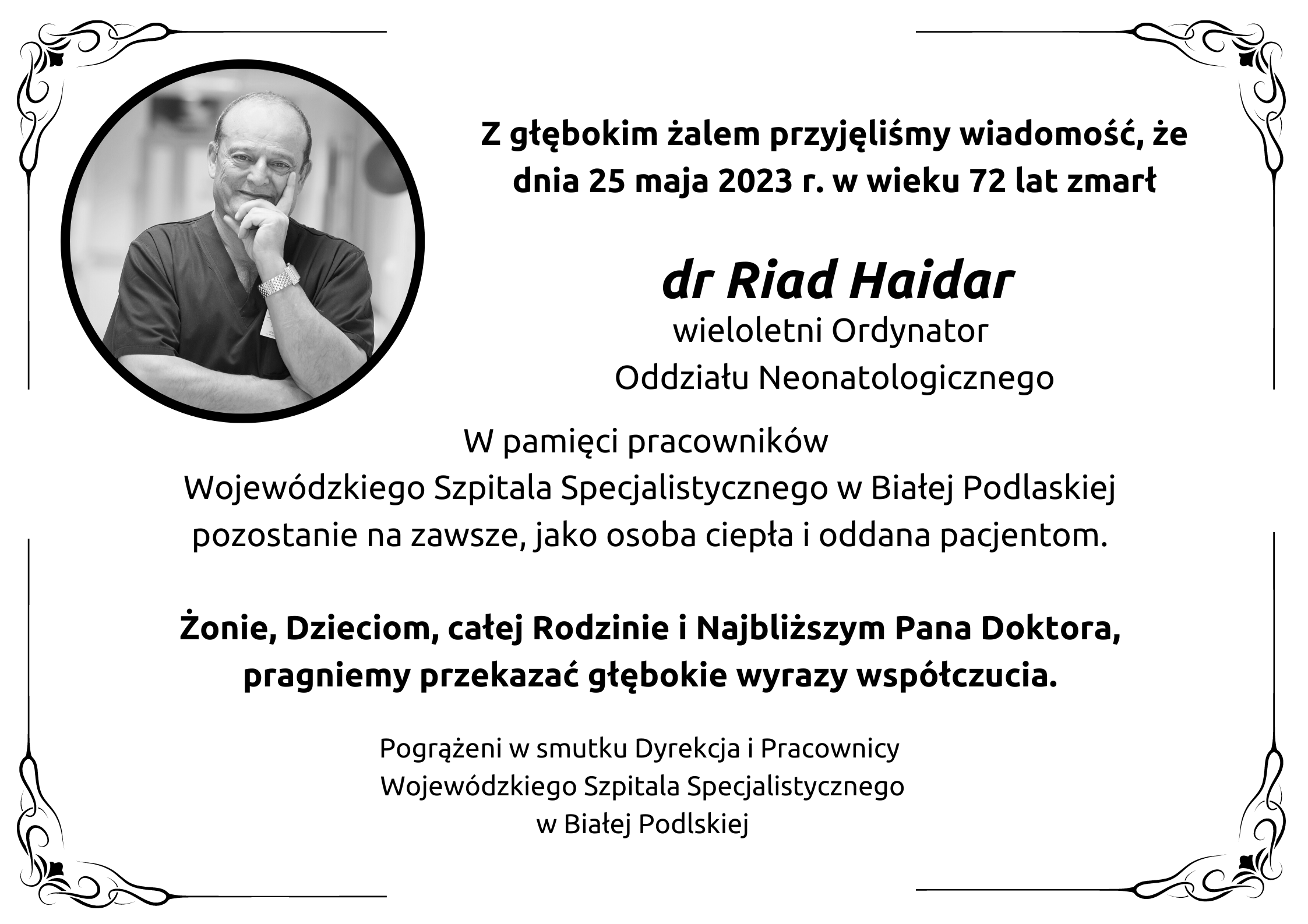 Pan Doktor Riad Haidar był zatrudniony w Wojewódzkim Szpitalu Specjalistycznym w Białej Podlaskiej od 1981r. po uzyskaniu tytułu lekarza na Wydziale Lekarskim Akademii Medycznej w Lublinie. Pracę rozpoczął, jako młodszy asystent kolejno zajmując stanowiska: asystenta, starszego asystenta, z-cy Ordynatora, Ordynatora/Lekarza Kierującego. Był inicjatorem i organizatorem w latach 1996-1998 Stanowiska Intensywnej Opieki Noworodków w Wojewódzki Szpitalu Specjalistycznym w Białej Podlaskiej. Po reorganizacji opieki nad noworodkami w szpitalu oraz utworzeniu w 2001r. Oddziału Neonatologicznego Pan Doktor Haidar pełnił w nim obowiązki Ordynatora, a po rozstrzygnięciu konkursu objął stanowisko Ordynatora Oddziału Neonatologicznego.