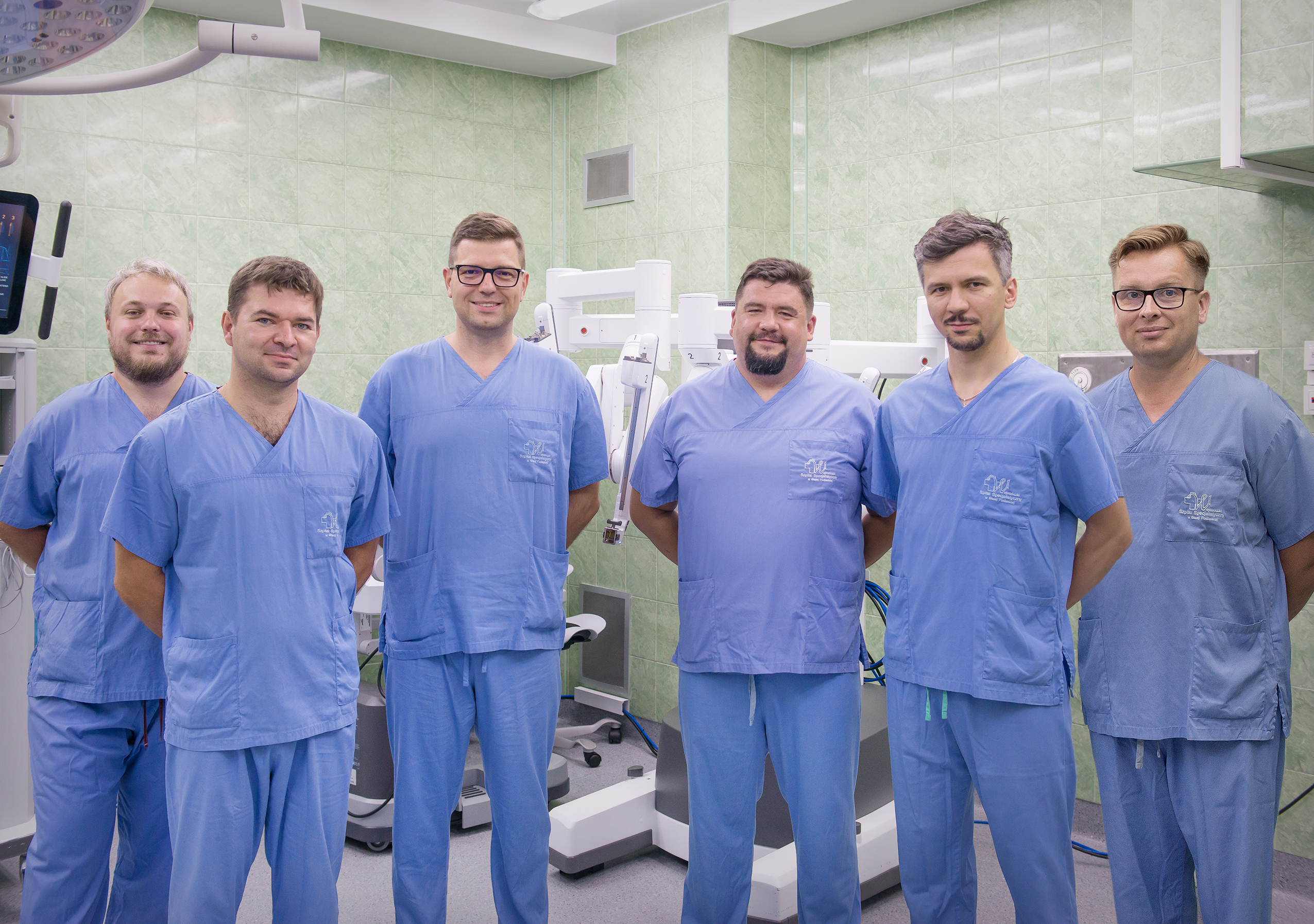 Na zdjęciu od lewej: lek. Ariel Andrzejuk – specjalista w dziedzinie ginekologii i położnictwa, lek. Filip Rozpotyński – specjalista w dziedzinie chirurgii ogólnej, w trakcie specjalizacji w dziedzinie chirurgii onkologicznej, dr n. med. Bożydar Tylus – specjalista w dziedzinie ginekologii i położnictwa, Lekarz Kierujący Oddziałem Ginekologiczno-Położniczym, lek. Kamil Kur – specjalista w dziedzinie urologii i chirurgii ogólnej, lek. Daniel Burdzy – lekarz koordynator w zakresie wdrażania i realizacji projektu – robotyka operacyjna w WSzS w Białej Podlaskiej, lek. Krzysztof Pękala – specjalista w dziedzinie urologii, Lekarz Kierujący Oddziałem Urologicznym.