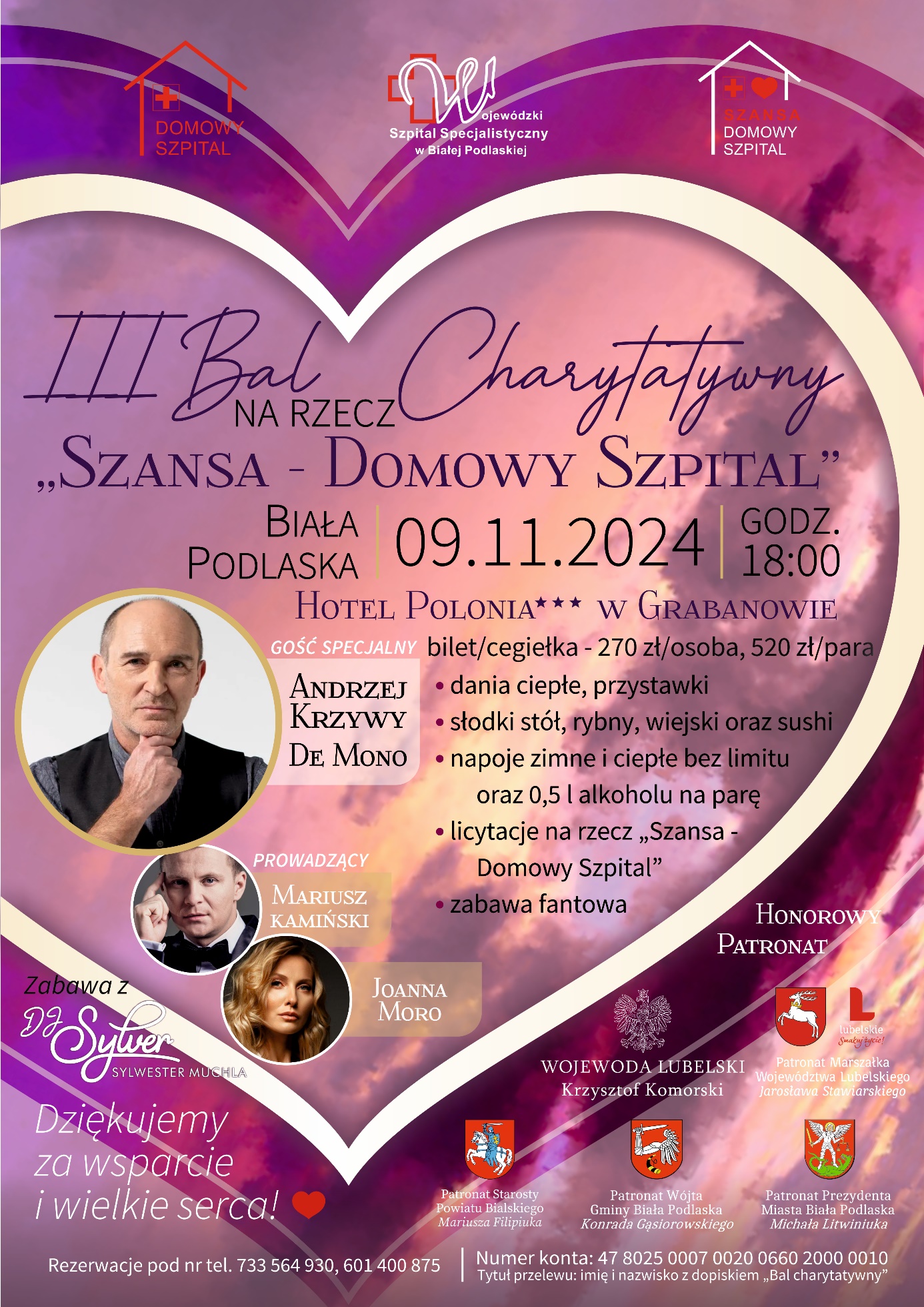 Po raz trzeci Stowarzyszenie na rzecz Wspierania Zespołu Opieki Medycznej ,,Domowy Szpital’’ Wojewódzkiego Szpitala Specjalistycznego w Białej Podlaskiej „Szansa – Domowy Szpital” organizuje Bal Charytatywny, którego celem jest zebranie funduszy na wsparcie pacjentów Domowego Szpitala.