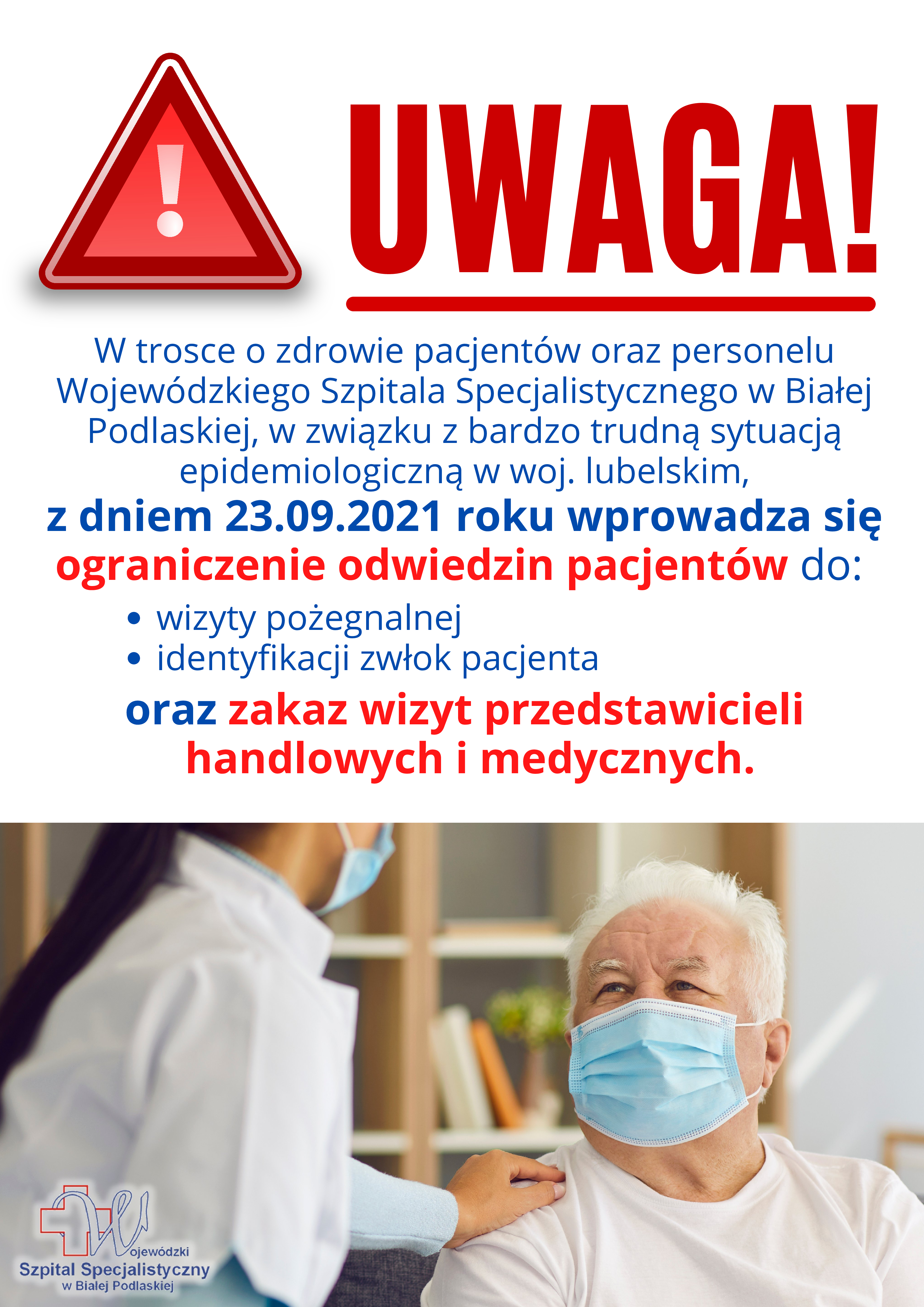 W związku z dynamicznie zmieniającą się sytuacją epidemiologiczną w naszym regionie, mając przede wszystkim na względzie bezpieczeństwo i zdrowie pacjentów oraz pracowników Wojewódzkiego Szpitala Specjalistycznego w Białej Podlaskiej wprowadzam ograniczenie odwiedzin w oddziałach szpitalnych oraz zakaz wizyt przedstawicieli medycznych i handlowych w szpitalu i poradniach przyszpitalnych. Powyższe ograniczenia będą obowiązywać od dnia 23.09.2021r. do odwołania.
