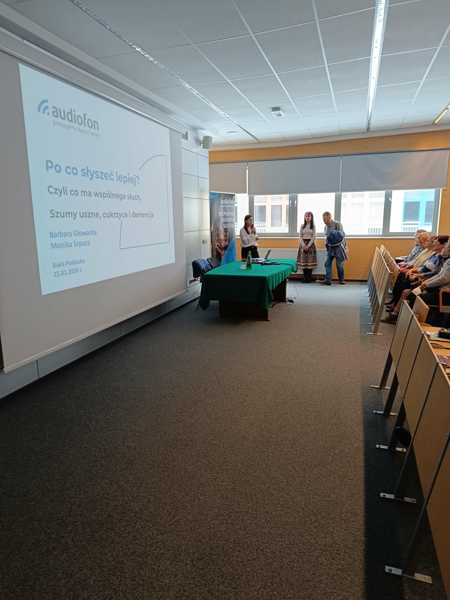 W dniu 25.01.2026r. odbyło się kolejne spotkanie Wirtualnego Klubu Seniora. Tematem spotkania był wykład „Słyszeć lepiej. Czyli co ma wspólnego słuch, cukrzyca i demencja”. Celem spotkania było zwrócenie uwagi na znaczenie dobrego słuchu w codziennym funkcjonowaniu oraz jego wpływ na ogólny stan zdrowia i jakość życia osób starszych. Podczas wykładu omówiono zależności pomiędzy niedosłuchem a chorobami przewlekłymi, takimi jak cukrzyca, a także jego możliwy wpływ na rozwój demencji. Podkreślono, że nieleczone problemy ze słuchem mogą prowadzić do izolacji społecznej, trudności w komunikacji oraz obniżenia sprawności poznawczej.