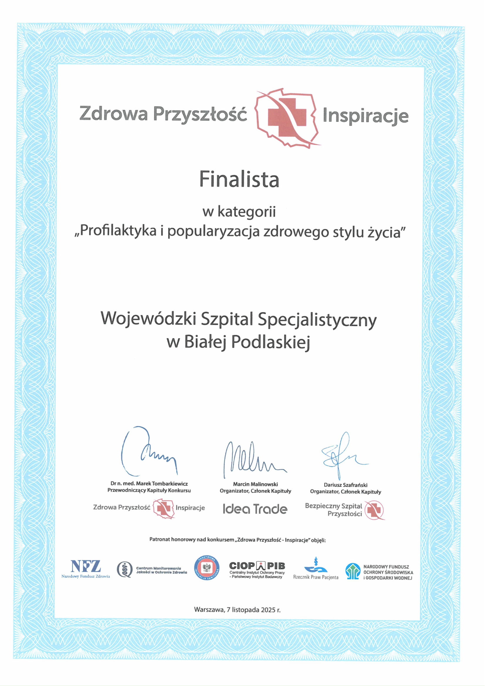 Wojewódzki Szpital Specjalistyczny w Białej Podlaskiej został wyróżniony w prestiżowym, ogólnopolskim konkursie „Zdrowa Przyszłość – Inspiracje”, organizowanym przez Idea Trade. Placówka znalazła się w gronie finalistów w kategorii „Profilaktyka i popularyzacja zdrowego stylu życia” za projekt „Wirtualny Klub Seniora” – inicjatywę, która w wyjątkowy sposób łączy edukację zdrowotną, profilaktykę i integrację społeczną osób starszych.