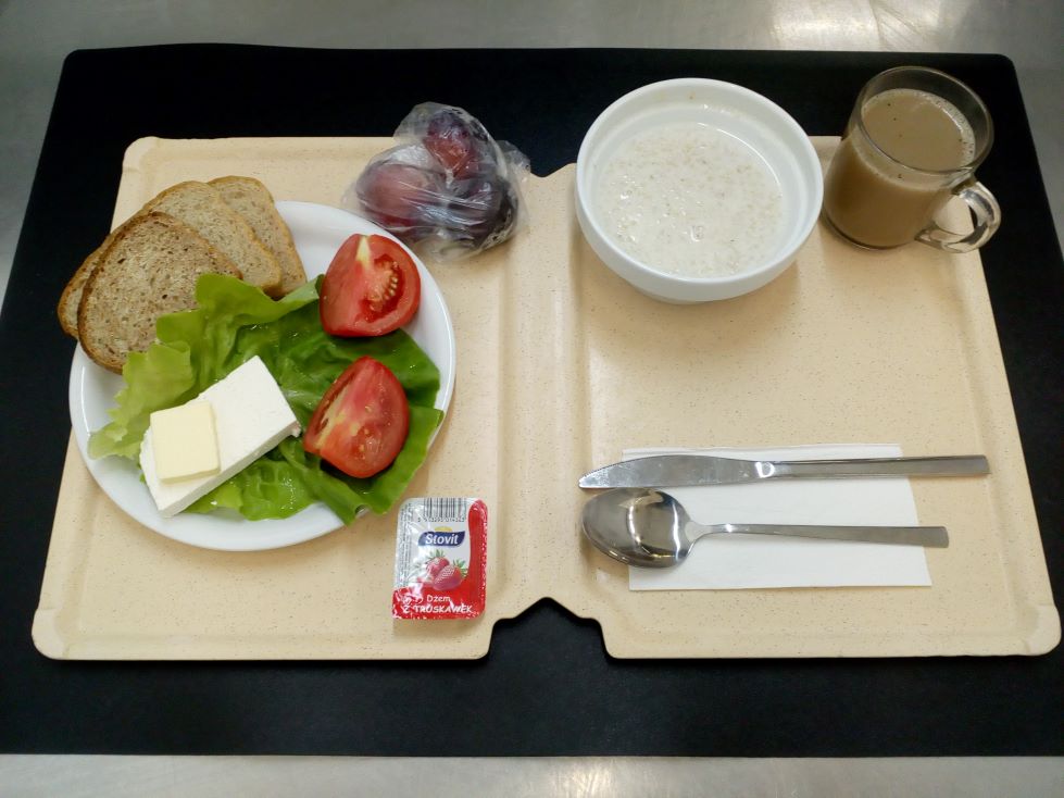 Dieta podstawowa Płatki jęczmienne na mleku 400 ml (GLU, MLE), Chleb mieszany pszenno-żytni 70 g (GLU), Chleb razowy żytnio-pszenny 30 g (GLU), Masło 83% tł. 15 g (MLE), Twaróg półtłusty plastry 70 g ( MLE), Dżem truskawkowy 25 g 1 szt, Sałata zielona masłowa 10 g, Pomidor 100 g, Kawa zbożowa z mlekiem z cukrem 250 ml ( GLU, MLE), Śliwka 150 g |